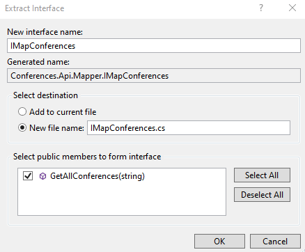 We'll now create another folder called Mapper. Where we'll want to create our EfConferenceMap.cs class and also our IMapConferences.cs interface. First create the EfConferenceMap.cs class like below: